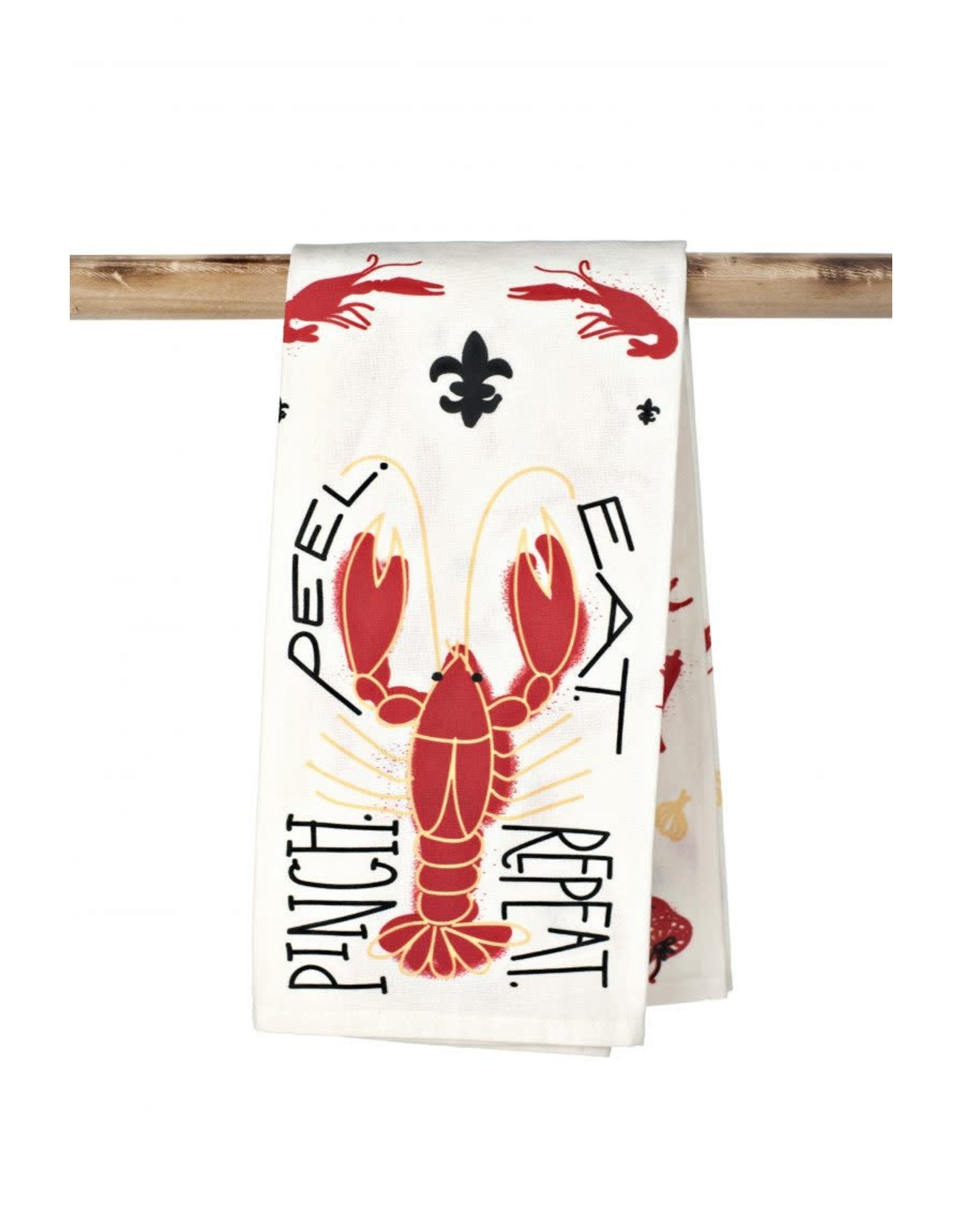 A white tea towel featuring artwork of a crawfish and Fleur de Lis with the words Pinch. Peel. Eat. Repeat. Measures 26″ tall, 17″ wide when unfolded. Hidden loop on the back for easy hanging when unfolded, the design is printed at the top and bottom so that when folded the image design is displayed on both sides